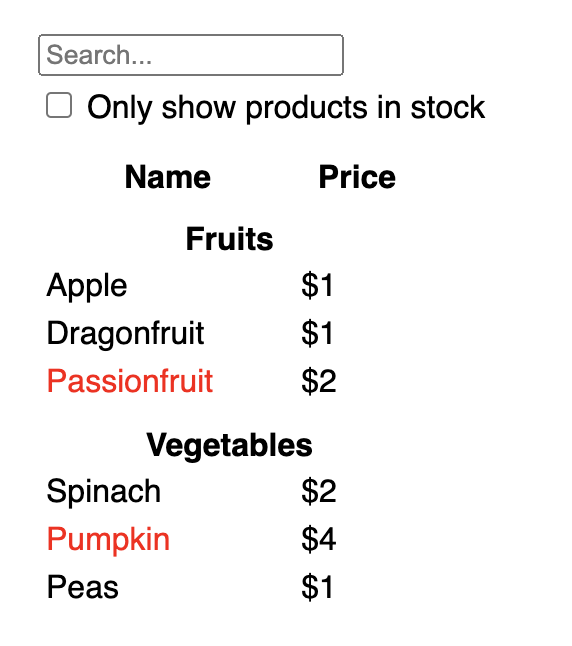 ProductTable을 보면 “Name”과 “Price” 레이블을 포함한 테이블 헤더 기능만을 가진 컴포넌트는 없습니다. 독립된 컴포넌트를 따로 생성할 지 생성하지 않을지는 당신의 선택입니다. 이 예시에서는 ProductTable의 위의 단순한 헤더들이 ProductTable의 일부이기 때문에 위 레이블들을 컴포넌트로 만들지 않고 그냥 남겨두었습니다. 그러나 이 헤더가 복잡해지면 (즉 정렬을 위한 기능을 추가하는 등) ProductTableHeader 컴포넌트를 만드는 것이 더 합리적일 것입니다.